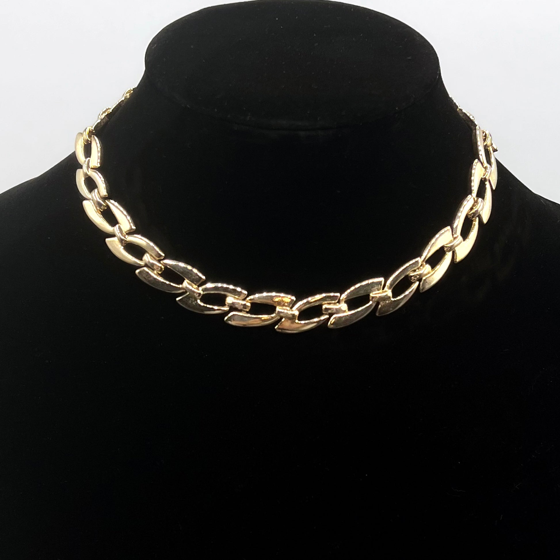 Sophisticated gold tone interlocking link choker. Necklace links lie very flat. Measures 16” x 1/2" but is adjustable to a shorter length. The hang tage is stamped Monet.