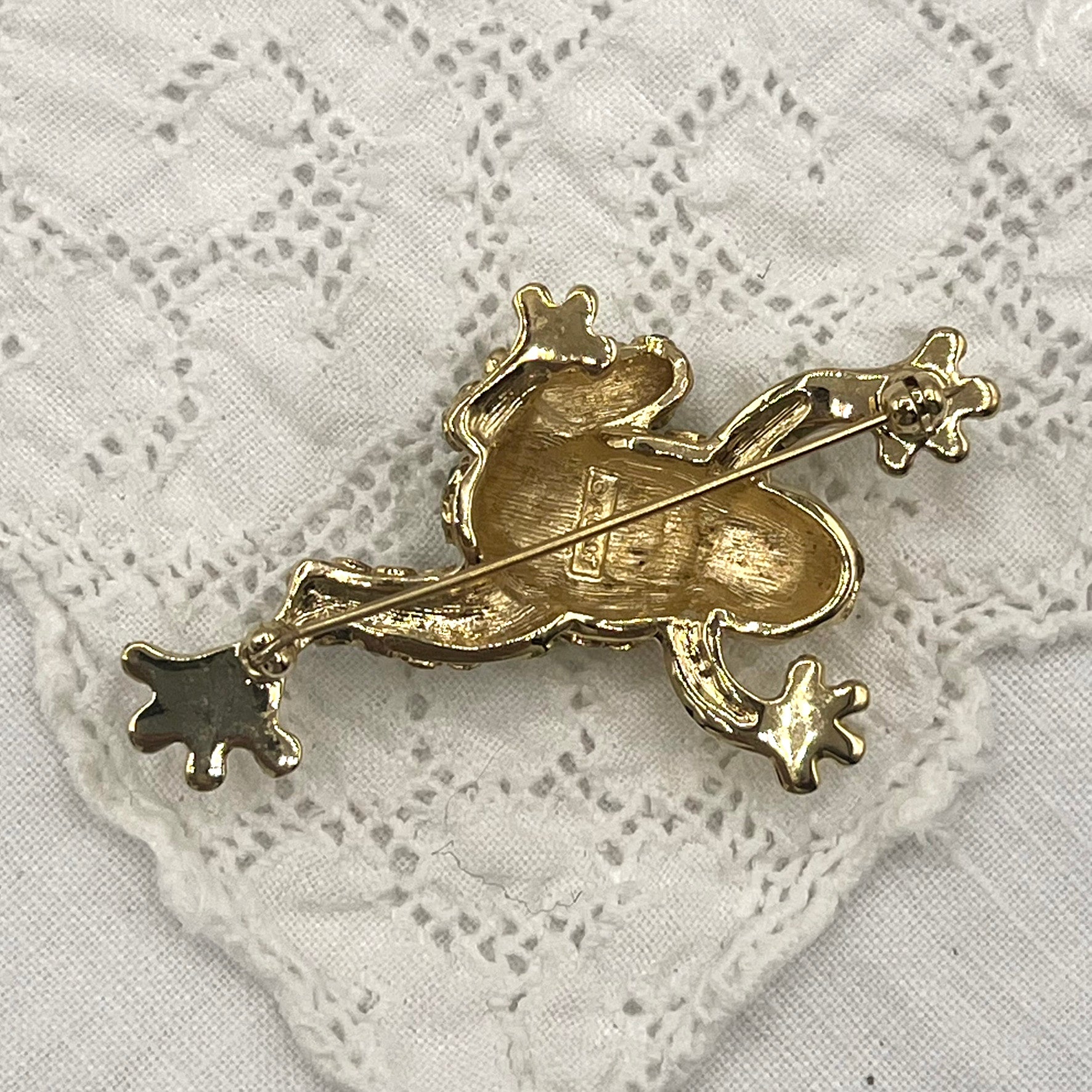 Beautifully detailed gold tone frog brooch with ombre green crystals. All crystals are intact.
