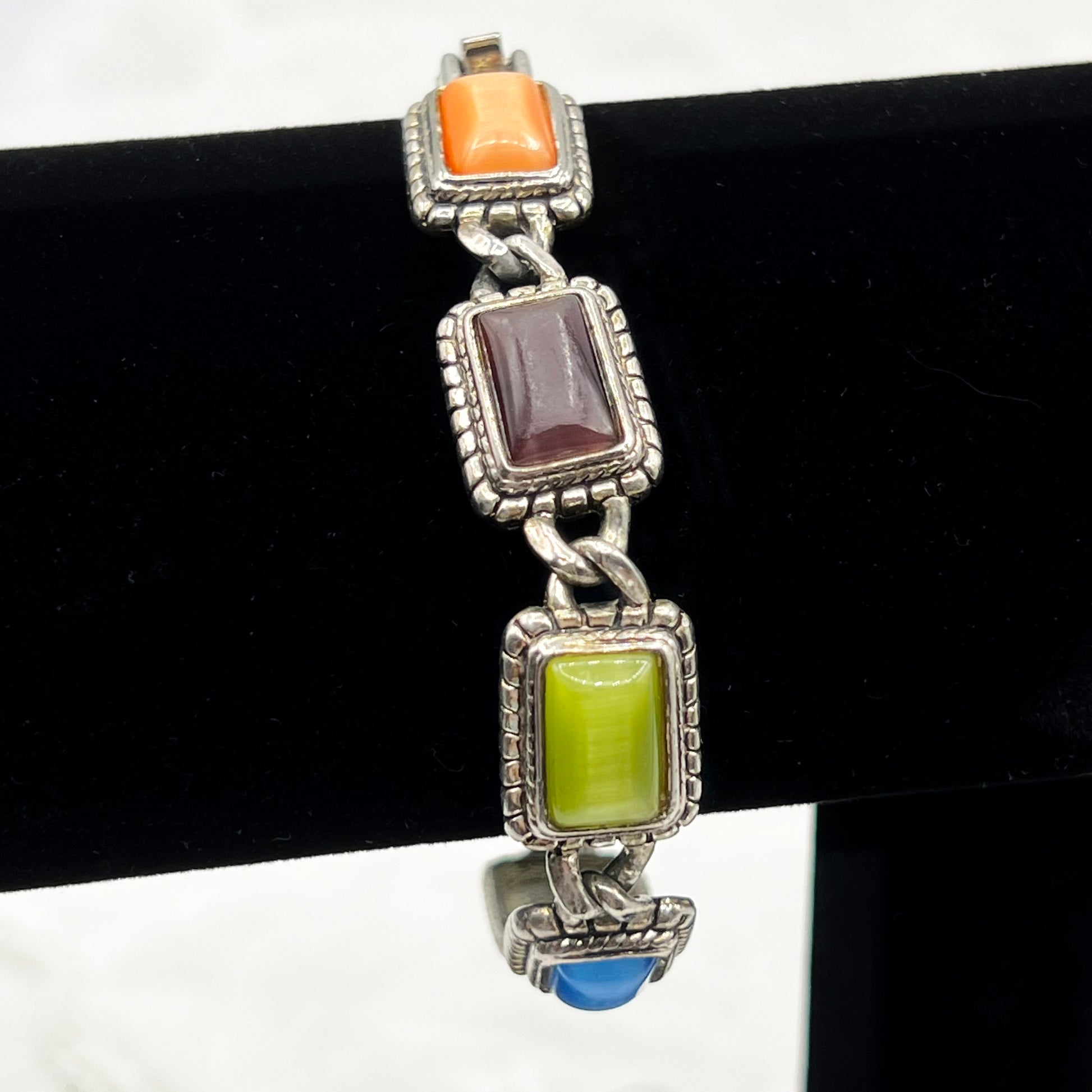 A colorful and classic vintage silver tone bracelet with eight rainbow color Moonglow stones. The cabochon stones are secured in rectangular bezels with a cool braided border