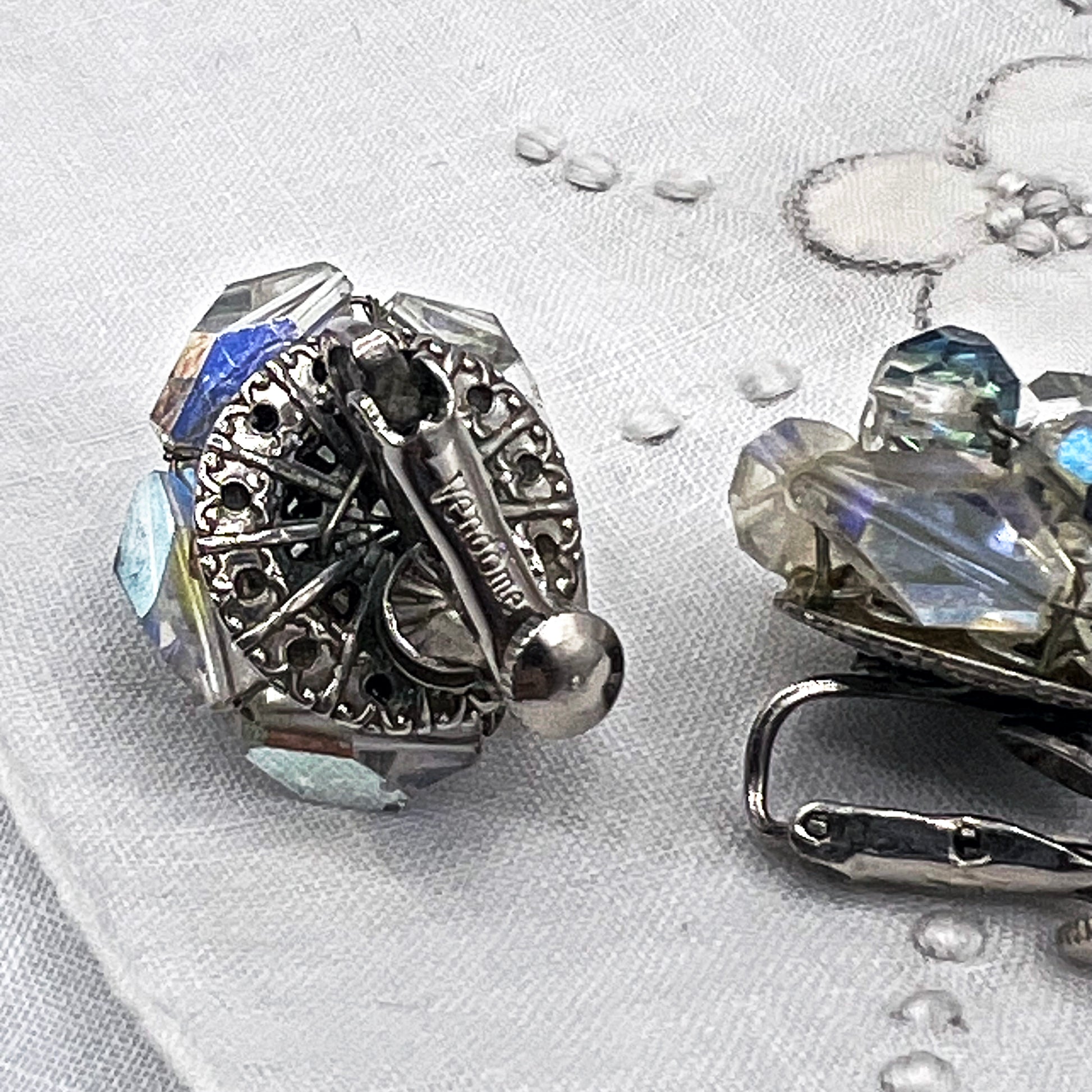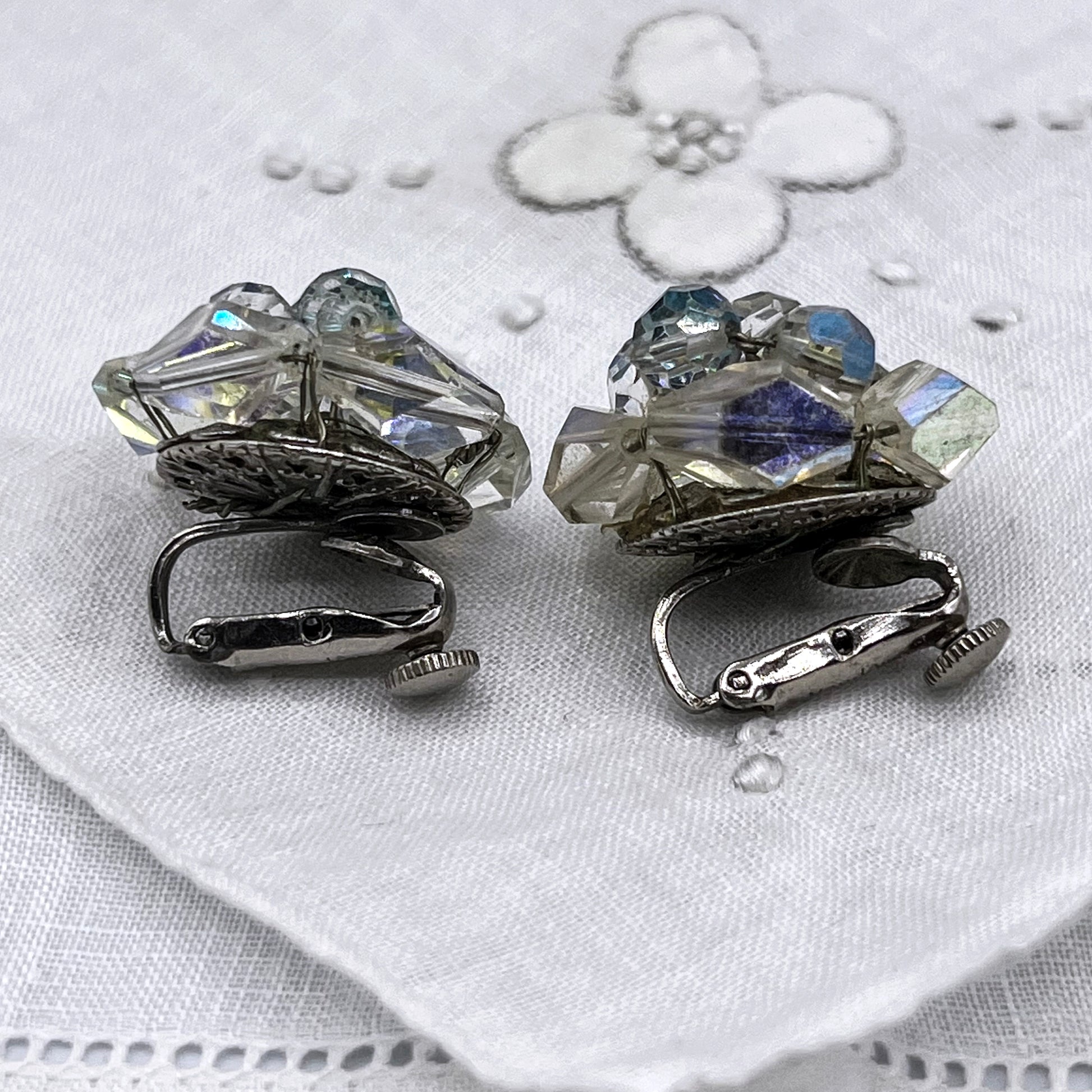 Light catching Vendome earrings with clusters of facetted Aurora Borealis rhinestones and screw-clipon backs.